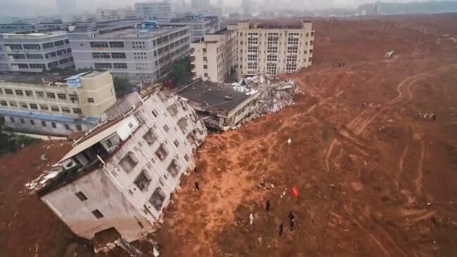 巨大な建物崩壊――空撮映像が泥に飲み込まれた現場を捉える